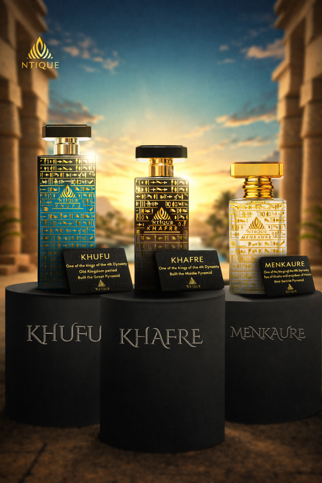 Inspired by the timeless legacy of Khufu, Khafre, and Menkaure, our collection reflects power, balance, and refined elegance in every note.